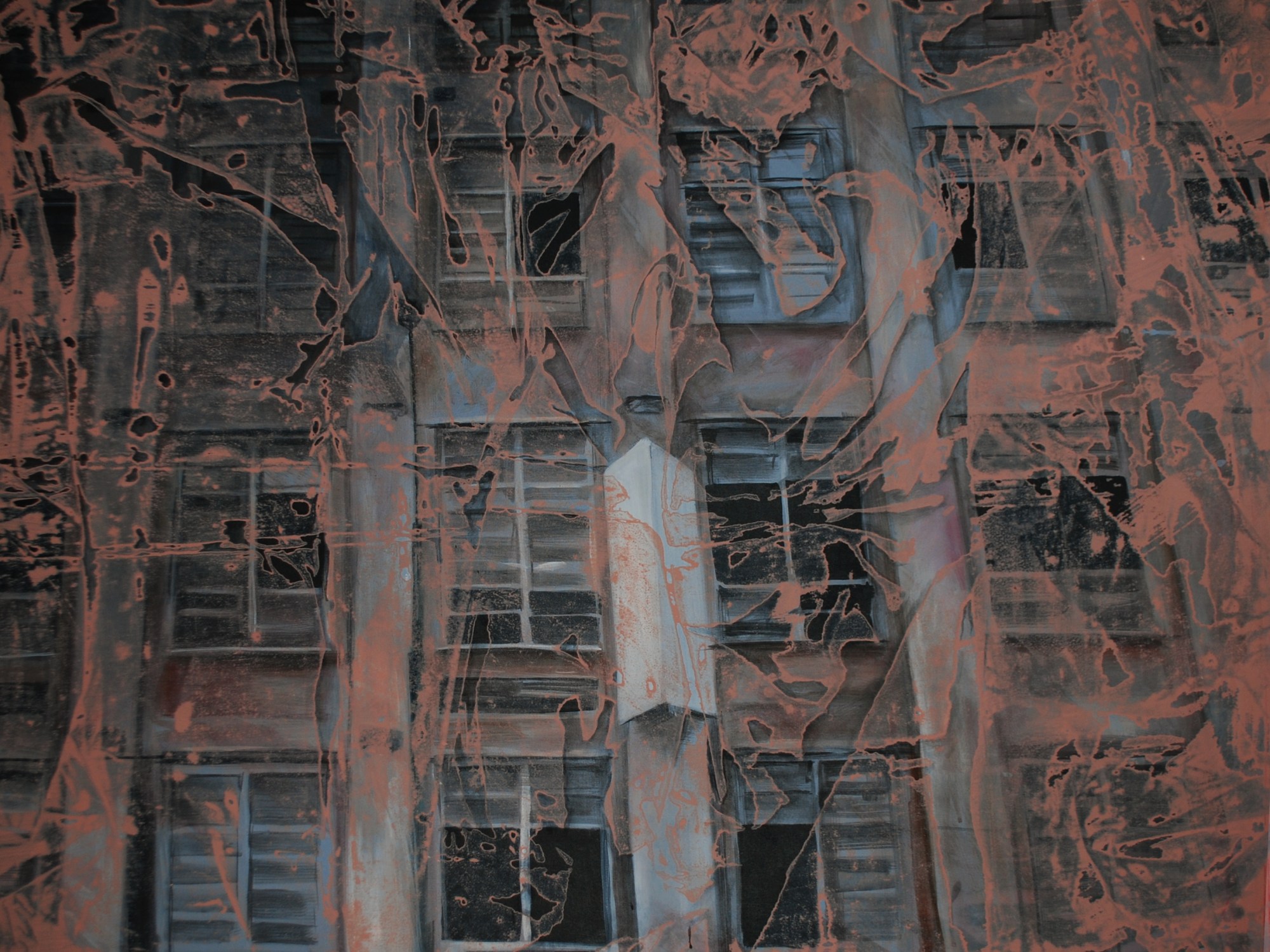 V sérii z Bratislavy, ktorú má Andrea ako rodné mesto nepochybne vrytú hlbšie v pamäti, si naopak všíma konkrétne stavby a rozpoznateľné miesta mesta, ktorých stav sa dá opísať ako bezútešný, či priam chorobný. Vníma ich ako rany, diagnostikuje ich s použitím medicínskej terminológie a vizualizuje takmer taktilné (ne)kvality omietky opadávajúcej z fasády, ktorú drží pokope developerskými bagrami ohrozený skelet. Pod Andrein drobnohľad sa dostávajú bývalá a nová Cvernovka s ich “vybitými zubami”, “obrezané” Františkánske námestie, “psoriatická” fasáda bývalej nemocnice na Zochovej, či “zhubný nádor” na bývalom Zuckermandli. Vyzerá to na epidémiu. Nachádzame sa v historickom okamihu, kedy sa tieto zranené miesta postupne dostávajú do pozornosti rôznych záujmových skupín. Andrea ich dokumentuje v ich dočasnej zdanlivo opustenej prítomnosti, ktorá v sebe vrství kapitoly mestského palimpsestu.[2] Ide o obžalobu zanedbania starostlivosti? Stanú sa nakoniec Andreine maľby nostalgickým suvenírom bývalej odpudivej krásy týchto (polo)ruín postupne transformovaných na ďalšie office priestory a apartmány za premrštené ceny?