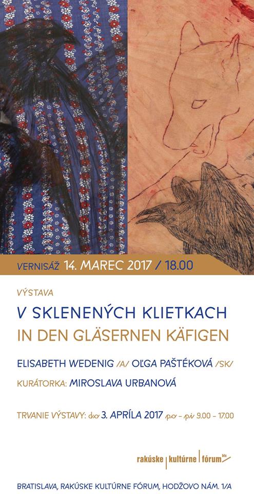 In den Œuvres der Malerinnen Oľga Paštéková und Elisabeth Wedenig taucht ständig das tierische Motiv auf, vor allem das Motiv des Vogels und des Wolfs. In der europäischen Kunstgeschichte tragen diese Tiere eine eigenartige Symbolik, sie personifizieren bestimmte Charakterzüge und sind gleichzeitig zu Objekten des wissenschaftlichen Interesses um die exakte Darstellung ihres Aussehens geworden. Die Sehnsucht zu verstehen, zu klassifizieren, zu quantifizieren und die Ergebnisse des eigenen Schaffens auszustellen, hat ausschließlich die menschliche Art – in den Petrischalen, in den Käfigen oder hinter findigeren Konstruktionen. Hinter der gläsernen Fassade des architektonischen Käfigs des Österreichischen Kulturforums präsentieren Oľga und Elisabeth einen ganz anderen Zugang dazu.