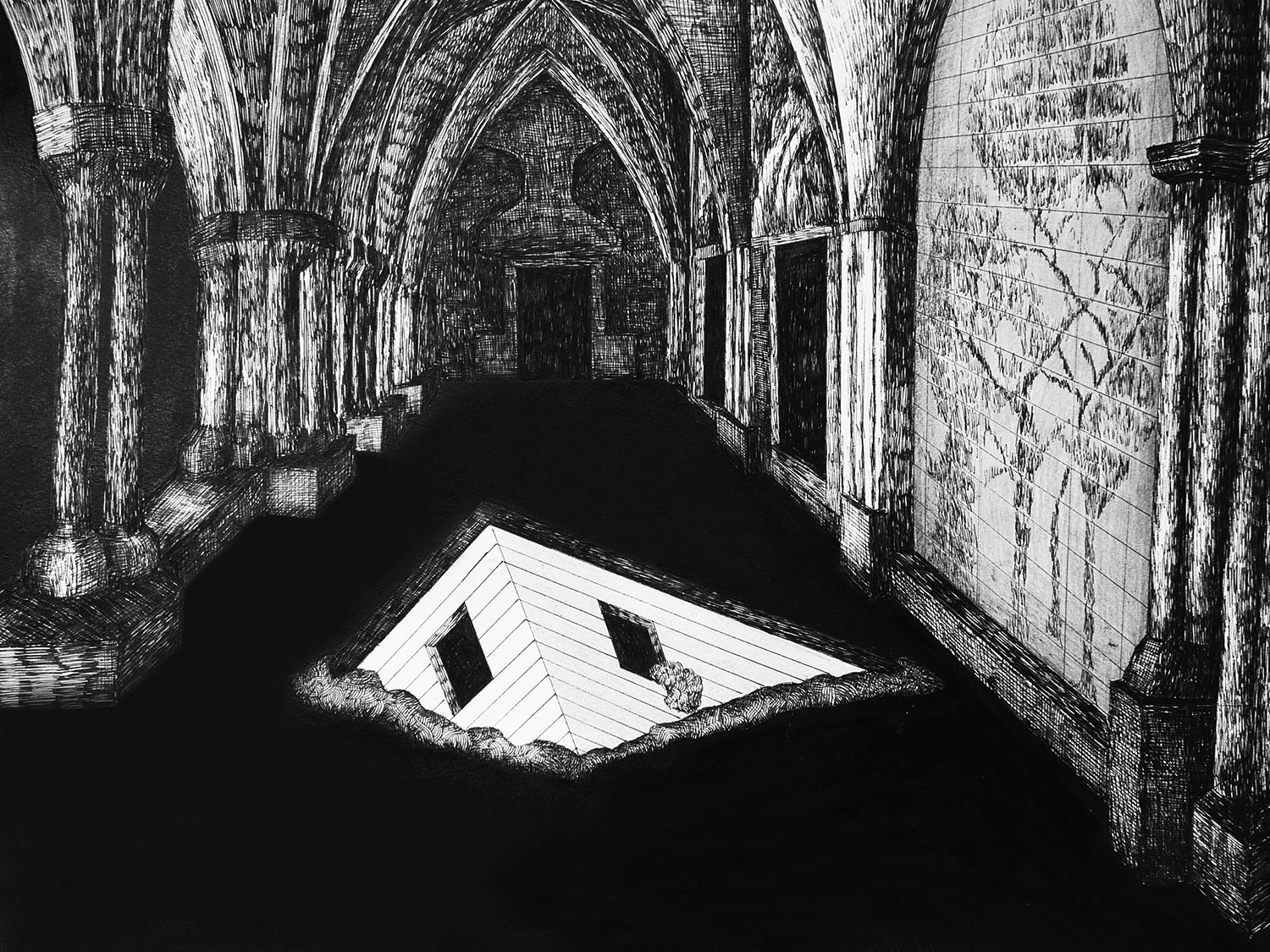 Christian symbolism and church as religious archetype is emerging in Mária’s œuvre regularly, last time in the series Stations of Crisis. In the newer Brave World the artist directs our gaze into the interior of sacral architecture: to the naves, transepts and chapels of the cloisters and cathedrals from Middle Ages. These are without doubt the most monumental material and artistic manifestations of the Christian tradition in Europe. She brings various strange objects and phenomena to these spaces and therefore disturbs the genre impression of the drawings. Indeed, these depictions of church interiors denote more metaphysical than physical space, but deprived of its divine aura represented by the light coming through the colourful glass windows. In these mute skeletons are the fragments of the secular world trapped in the iconic black matter/fluid. The artist shifts the discussion to the framework of thinking about systems (religious, social, cultural), about their borders, confrontations and overlaps. According to legends, at the beginning of the world there was light. And at the beginning of the art/painting there was a line drawn alongside the shadow.