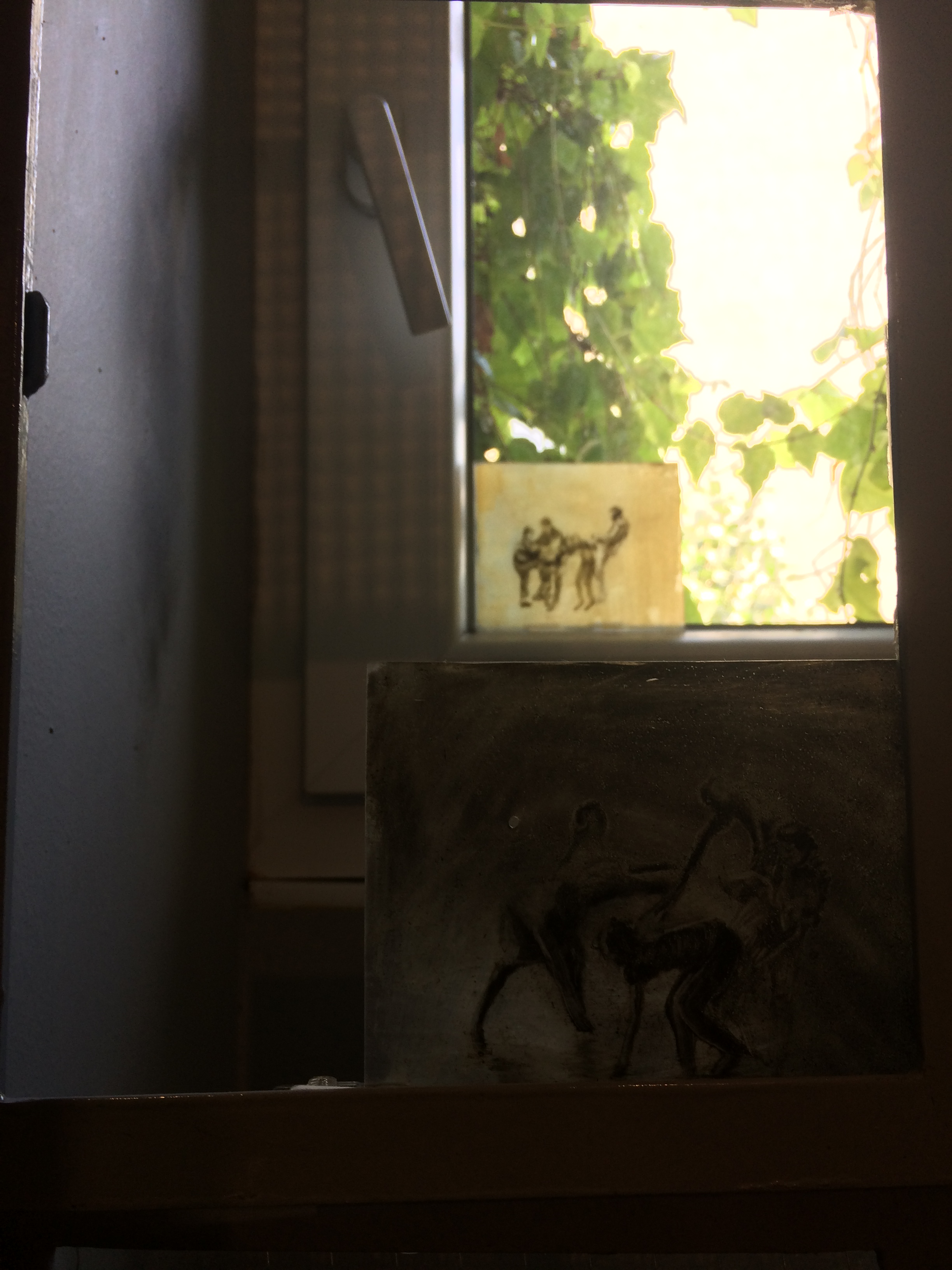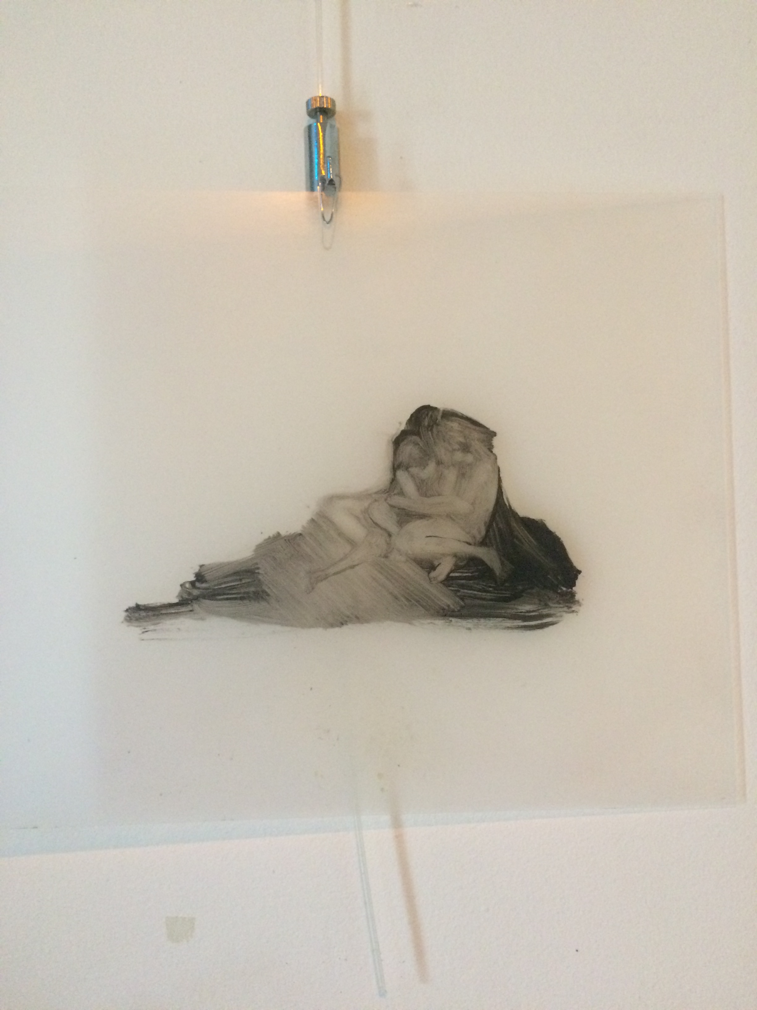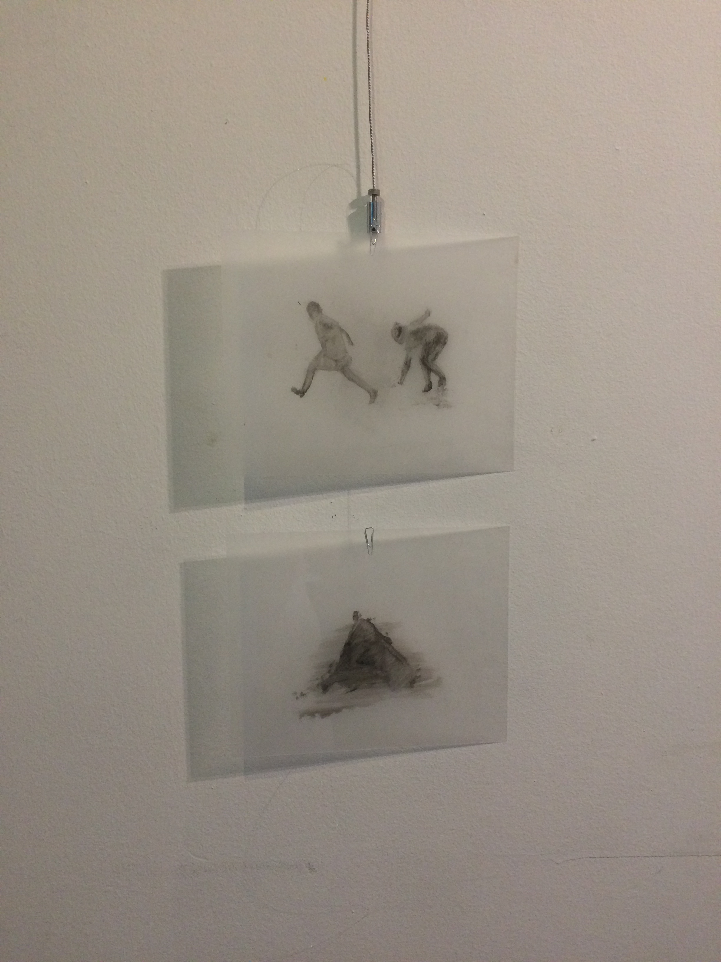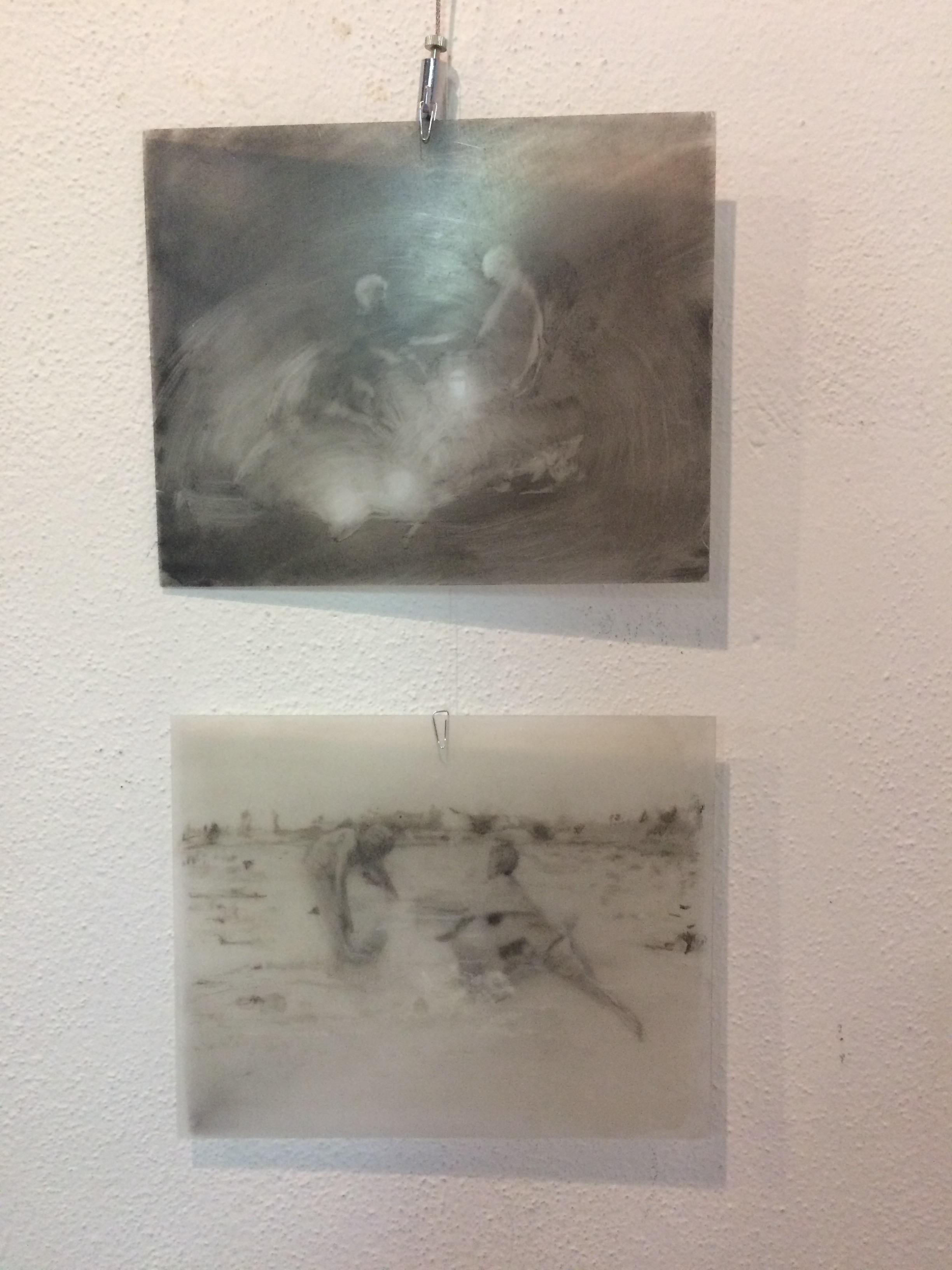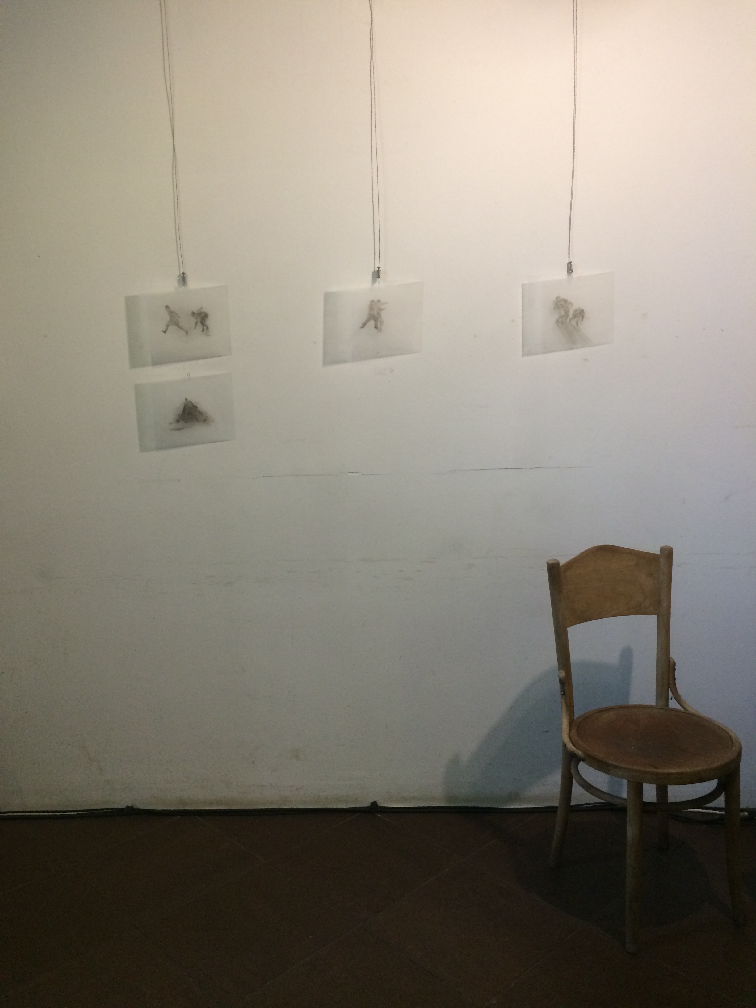 Her current exhibition, again with an almost movie-like title, Honey under the Surface continues in this way of thinking. The artist follows up the tread of her previous projects, where she created from the number of images on the shrinking foil some kind of kaleidoscope of visually appealing, although monochrome and in their essence chilling, scenes. She paints again on the surface of the foil, she shrinks some of them by baking them, leaving the rest unshrunk in their original size. She does not create coherent storylines like ones from the movie images, she repeats and intensifies the shades of originally existentially threatening situations. The scenes of aggression or migration are part of the universal human experience, but the abundance of such pictures mediated by the media changes our sensitivity threshold, interest and empathetic attitude of the viewer. Kováčik takes advantage of the fact that we never perceive the picture as purely static, we see some situation behind, some kind of action, performance. She multiplies some scenes in an attempt to give to the viewer the possibility of searching for his centre, the right angle, to find under the surface the movement in the static.