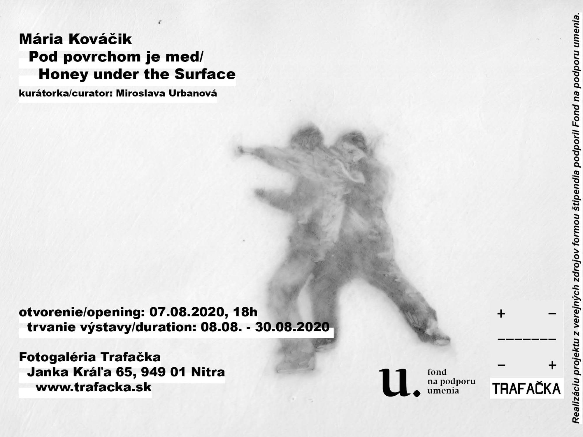 Možná prítomnosť medu pod povrchom (materiálnym, imaginárnym či obrazovým) tu evokuje niečo prekvapivé, nečakané a nie nutne príjemné. Vyvoláva ambivalentné pocity a asociácie – voňavé i lepkavé, príťažlivé i odpudivé – podobne ako to, čo sa skrýva pod digitálne upravovanou vrstvou reprezentácie každodennosti a jej prežívania v súčasnosnom svete hyperviditeľnosti, transparentnosti, ale aj cenzúry a manipulácie. Neuchopiteľnosť výjavov v ich celistvosti, subtílnosť ich prevedenia, chýbajúce informácie ako farby, kontrasty či detaily prostredia, tvárí, nás nútia k bližšiemu pohľadu, ktorý nás však možno ešte viac zneistí. Ako nájsť v mori vizuálneho smogu a pretlaku informácií miesto, ostrov v sebe, z ktorého vidieť podstatu vecí?