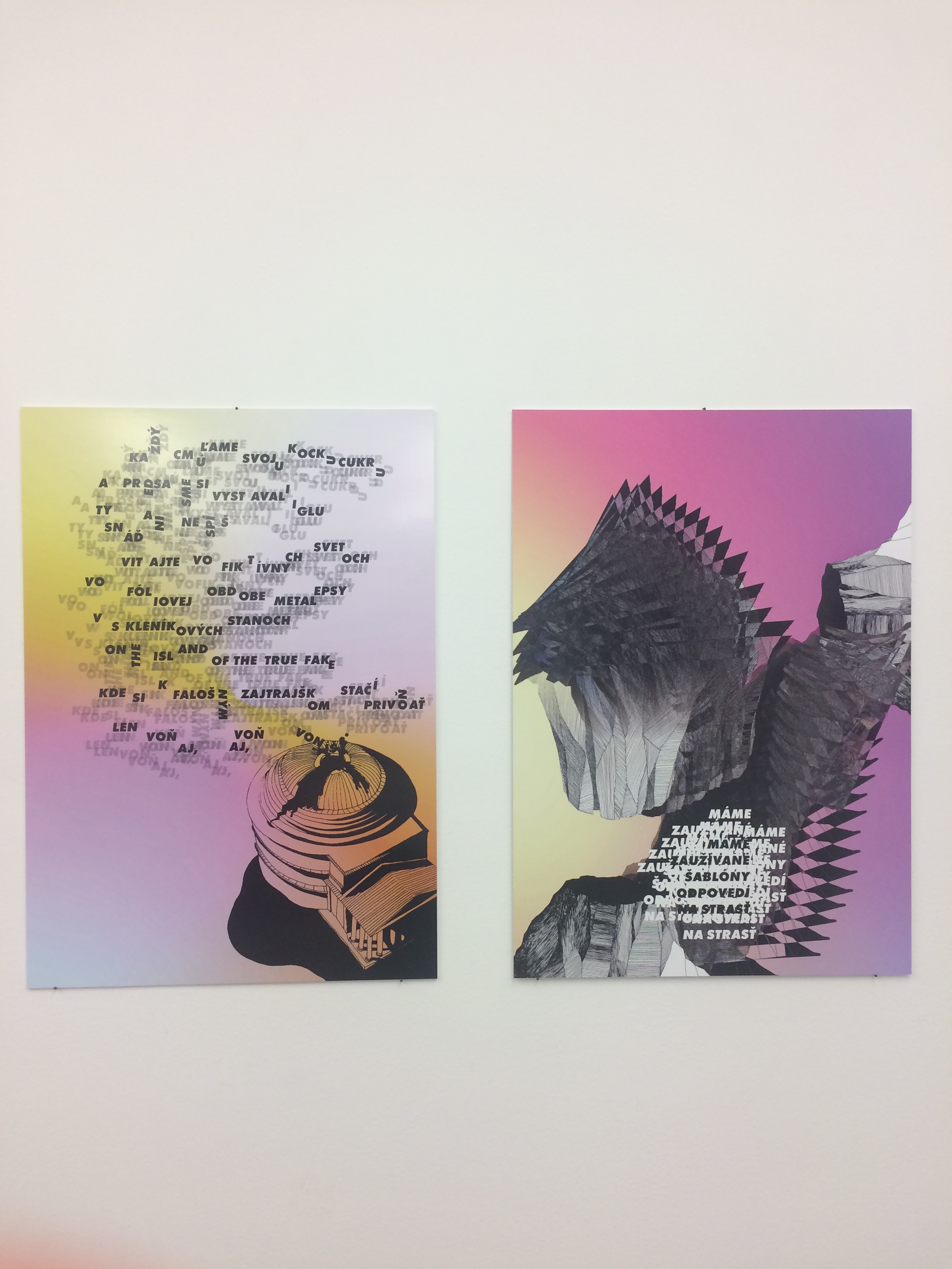 Nalákajú ťa na ľúbivé vizuály. Dúhové gradienty, ktoré máš tak rada/ rád vo svojom insta feede, senzuálnu červeň, veľké, všeobjímajúce plochy. Vypláchnu ti oči a uši jazykmi…, ktoré síce rozoznávaš, no potrebuješ ich prefiltrovať cez hlbšie vrstvy vedomia a poznania. Kde sa zobrazené veci a javy Čorejovej kresieb správajú inak ako to poznáš, v drzej poetickej licencii, resuscitujúc formát plagátu výbojmi politiky. Znepokojivý beat, kadencia a významy Husárovej hovorených slôh zas nepripomínajú zvyčajnú nabúchanú rapovú maskulínnu šukačku. Je to však rep a ty si spomenieš, že aj ženy striekajú a hoci nie s účelom plodenia, zem sa vždy zatrasie. Už aj umelkyne môžu všetko? Aj keď sa na chvíľu cítiš v beztiaži intelektuálneho (roz)poznávania, si neodlučiteľne prepojená/ý so svojím telom a s rodom, ktorý si prijal/a za svoj. A budeš to tak pravdepodobne vnímať.