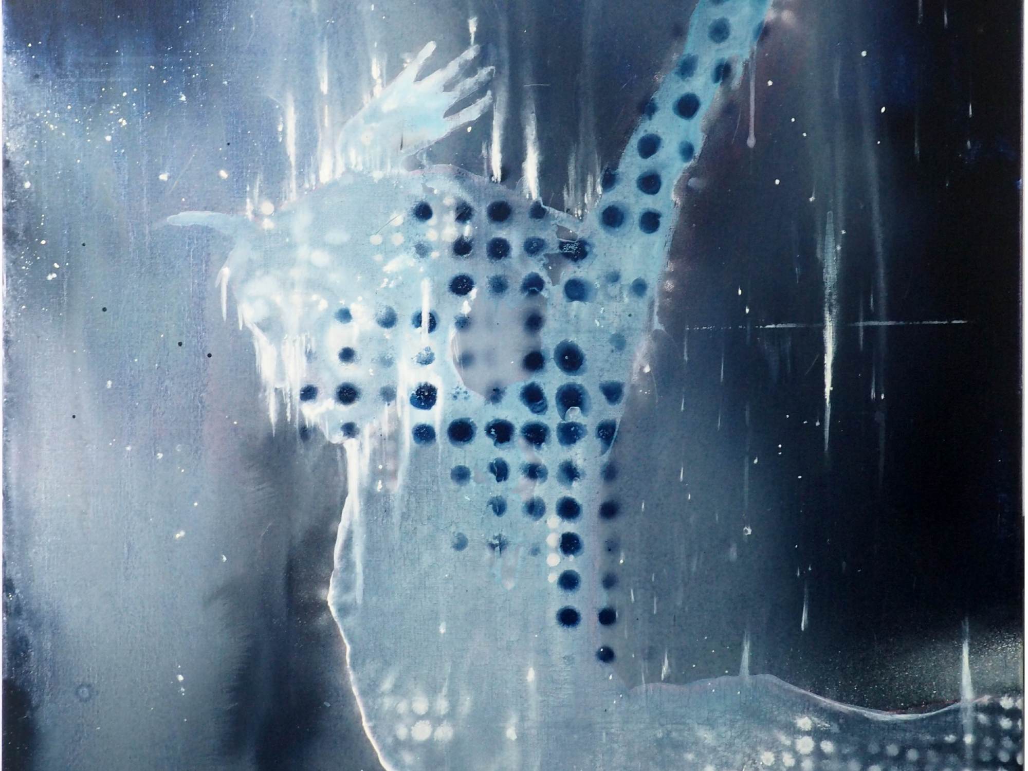 obraze Frozen (Zamrznutá). Tento dojem umocňujú, okrem kompozície, aj monochromaticky poňaté figúry. Ostávajú abstrahované v obrysoch a odtlačkoch plných pulzujúcej, exaltovanej energie. Akoby sa však zároveň stali stelesneným varovaním pred sebou samými, pred naším vlastným perfekcionizmom, túžbou byť na vrchole stále, ktorej realizácia však nezávisí iba od nás.