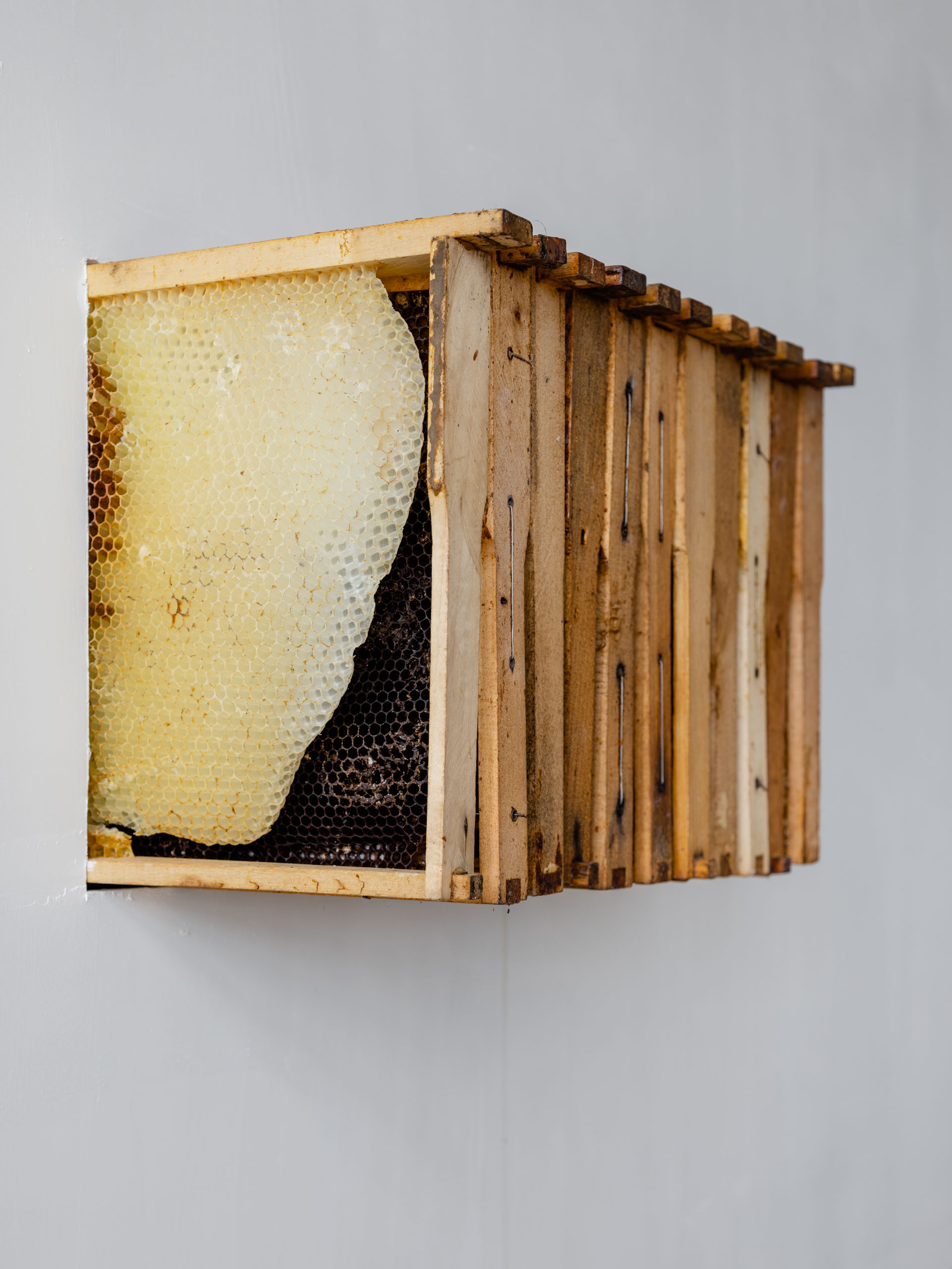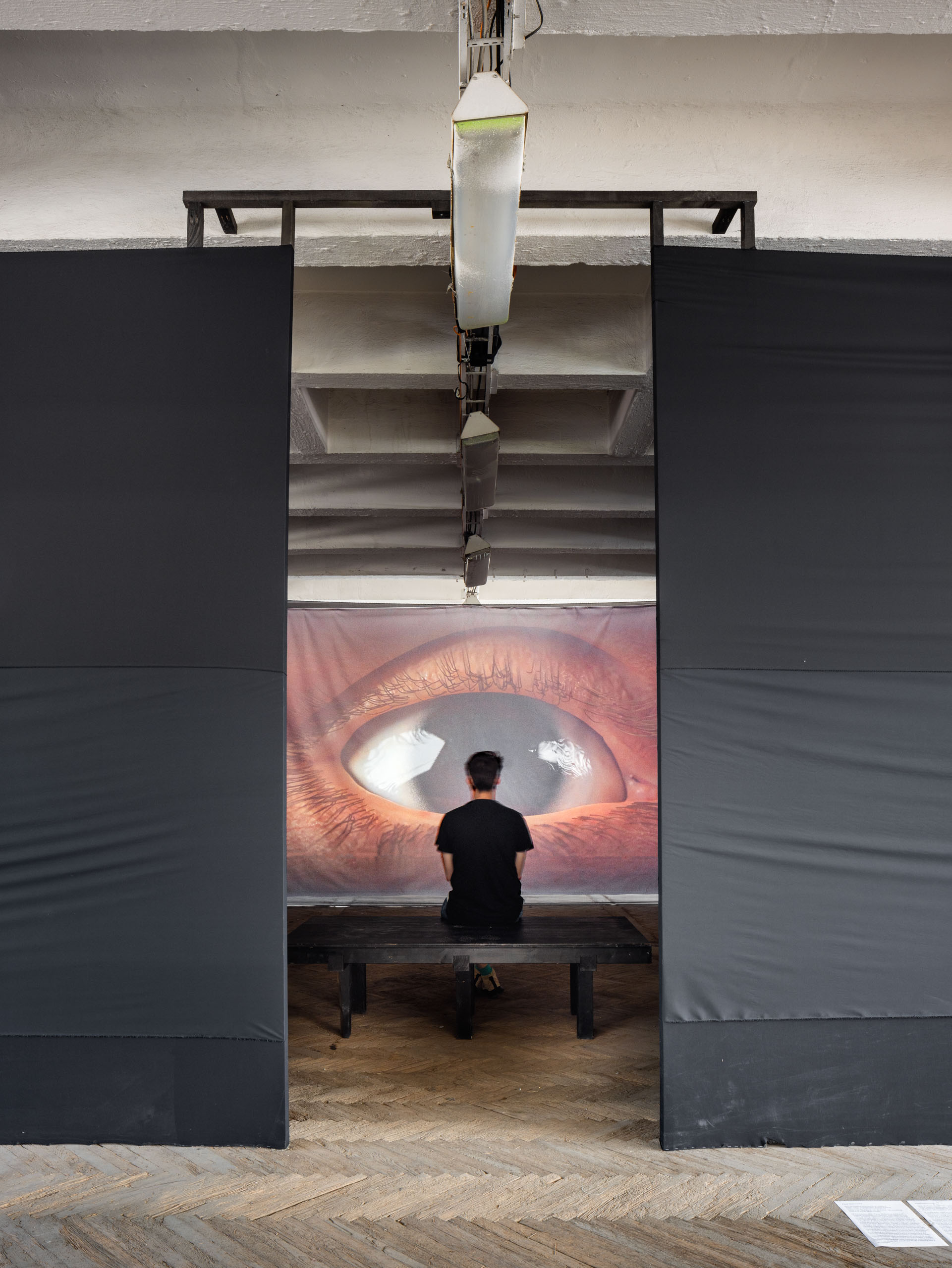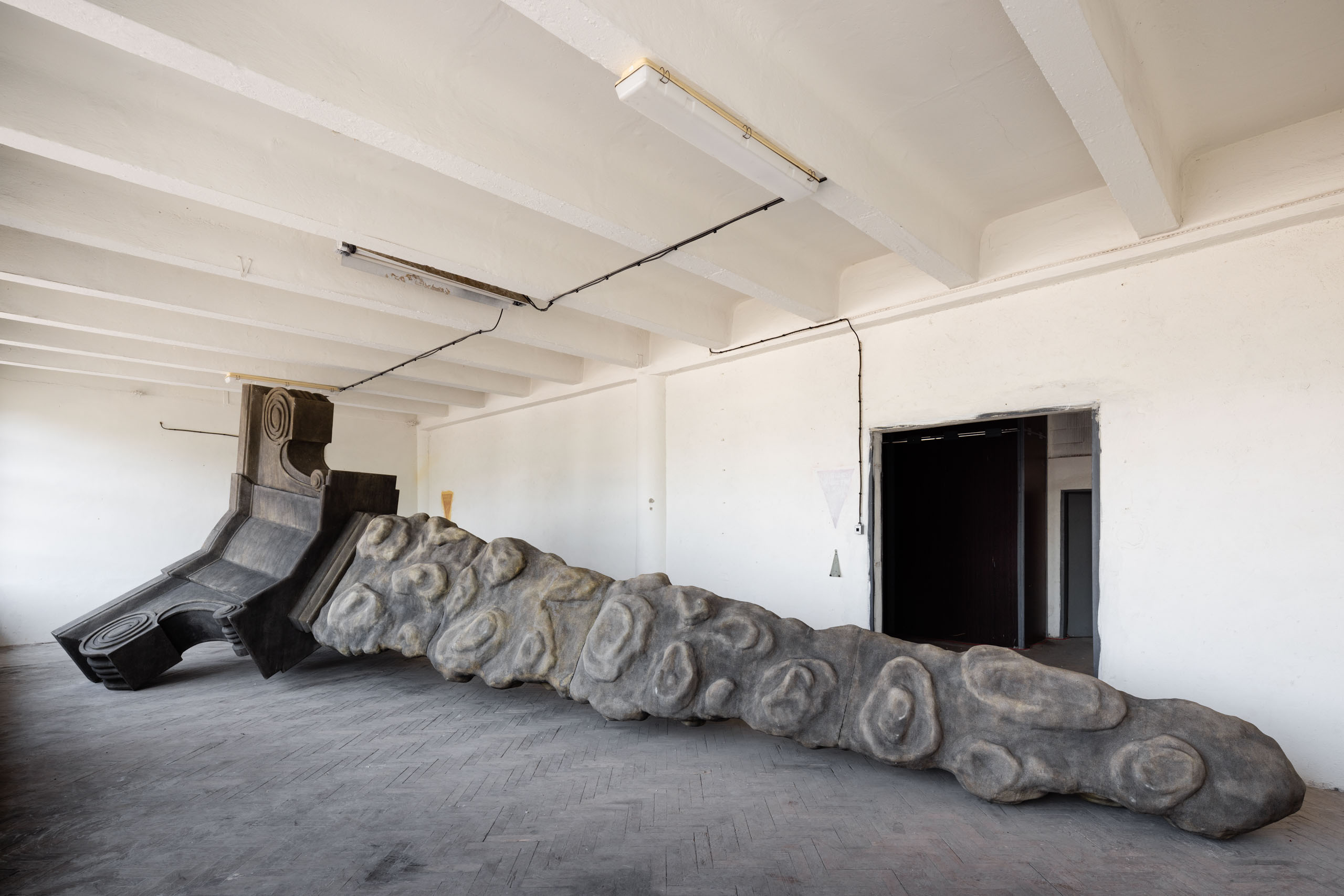 The exhibited works of visual artists are a reflection of the branching thinking in/about/within the cocoon, in the specific space of a functioning carpet factory. The exhibition does not attempt to weave the narratives and themes of the individual works into an easy-to-read pattern, leaving room for the creation of free visual and semantic associations and connections. Themes stretching from the downfalls of grand universal narratives such as technological advances connected with e.g. industrialization, ruptures in history and crises of relationships within different (eco)systems, their intertwining with the personal stories of individuals, or thinking about architectural space without sharp edges, without a division between the outside and the inside, are here entangled and untangled again, stretching across the generous hall space. A space that has a memory of its own, like the landscape that absorbs and stores material in its chemical essence in its subsoils, continuously sedimenting substances from its surroundings. And ultimately, like the people who try to gradually reveal but also obscure these layers, selling information about their small and big stories to each other.